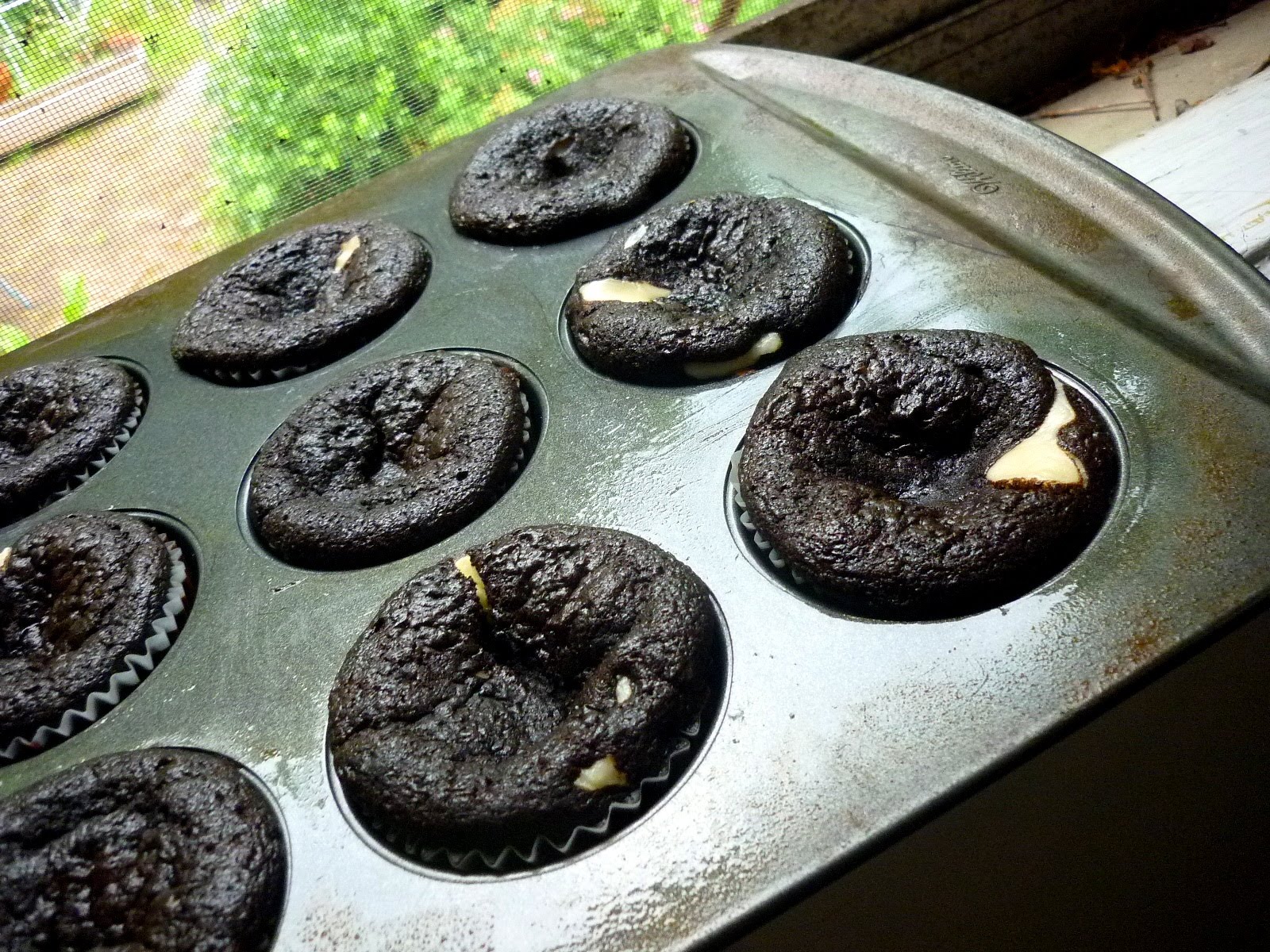 These were supposed to be Black Bottom Cupcakes, but something funny happened in the heat of my oven. Essentially all of the cream cheese filling I had carefully dolloped in the midst of my cupcakes was overpowered and encased by rising cupcake dough. The cupcakes depicted are actually a minority, the resolute few whose cheesecake filling refused to be wholly submerged in a tide of rising dough. I thought they’d photograph better than the others, which look exactly like regular chocolate cupcakes with sunken tops. This sunken-ness is typical of all black-bottom cupcakes and is a design feature rather than a flaw.